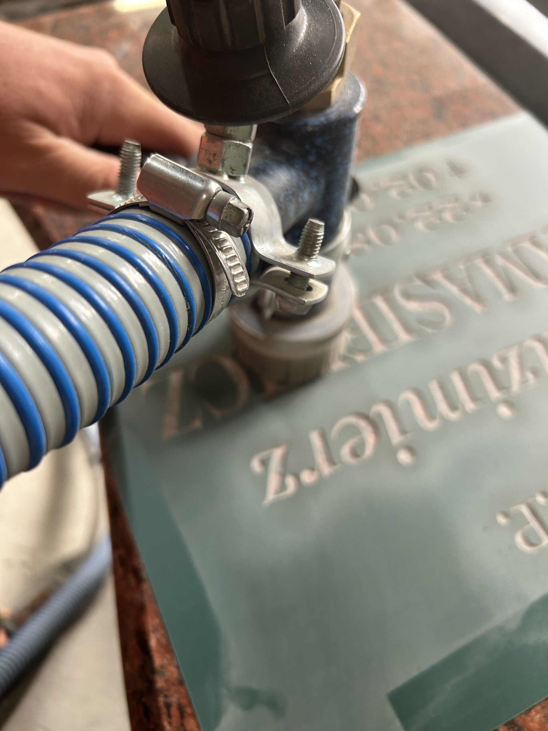 Liternictwo metodą piaskowania to technika, w której strumień drobnego ścierniwa pod wysokim ciśnieniem precyzyjnie wycina litery lub wzory w kamieniu.